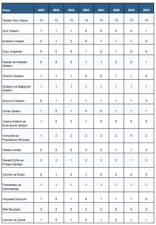 Tablo açık biçimde gösteriyor ki dolaşım ve bağışıklık sistemi sürekli görünür olan bir alandır. Genetik şifre ve protein sentezi de yıllar boyunca ağırlığını korumuştur. Fotosentez ve kemosentez başlığı neredeyse her yıl soru üretir. Bitki biyolojisi bazı yıllarda iki ya da daha fazla soruyla öne çıktığı için kesinlikle ihmal edilmemelidir. Komünite ve popülasyon ekolojisi de düzenli tekrar eden güçlü başlıklardandır.