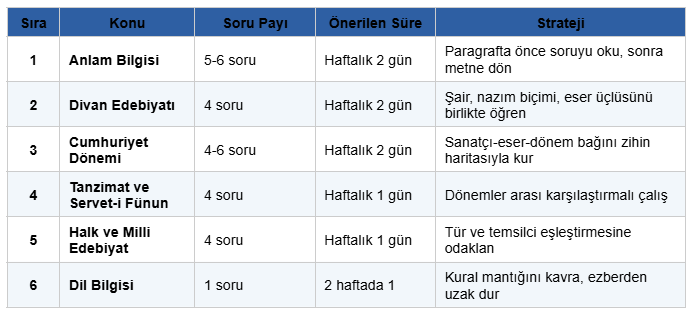 Sınava 6 aydan fazla vakti olan öğrenciler Divan Edebiyatı ve Anlam Bilgisi'ni derinlemesine tamamladıktan sonra Cumhuriyet dönemi sanatçılarına geçmelidir. Sınava 3 aydan az vakti kalanlar ise Anlam Bilgisi, Divan Edebiyatı ve Cumhuriyet dönemi sık çıkan sanatçılarına odaklanmalıdır; bu üç alan toplam soruların yüzde altmışını karşılar.
