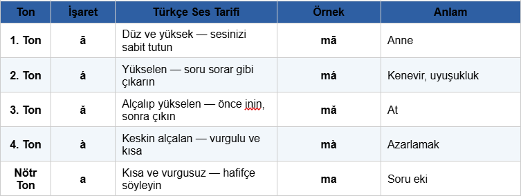 Çincenin en zorlu boyutu tonlama sistemidir. Mandarin Çincesinde dört temel ton ve bir nötr ton bulunur. Aynı hece, tona göre tamamen farklı anlam taşır. Yanlış ton kullanmak yalnızca komik duruma düşürmez; iletişim tamamen kopabilir.