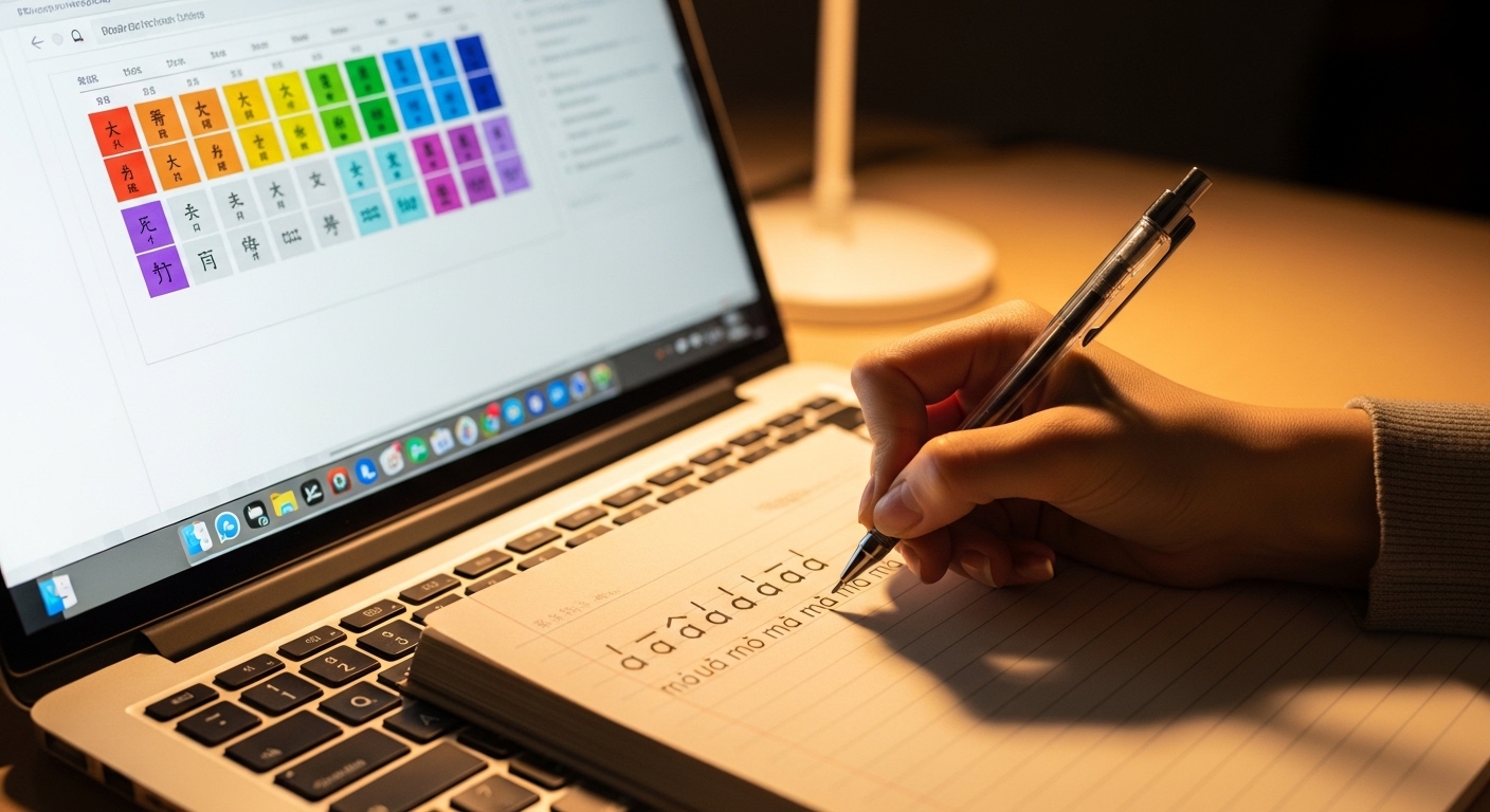 Çince derslerinin ilk aşamasında Pinyin ve radikal sistemi birlikte ele alınır. Her Çince karakterin içinde anlam taşıyan bir kök bileşen bulunur; buna radikal denir. Su anlamına gelen radikal; nehir, okyanus ve yüzmek gibi kelimelerde tekrar eder. Ateş anlamına gelen radikal ise pişirmek, sıcak ve alev gibi kavramlarda yer alır. Yaklaşık 200 temel radikali öğrenmek, yeni karakterleri tahmin etmeyi ve akılda tutmayı önemli ölçüde kolaylaştırır.