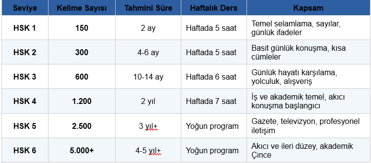 Çince öğrenme süresi, haftalık çalışma miktarına ve hedef seviyeye göre değişir. ABD Dışişleri Bakanlığına bağlı Dil Enstitüsü FSI verilerine göre Mandarin Çincesi, İngilizce konuşanlar için en zor diller kategorisindedir ve akıcı düzeye ulaşmak yaklaşık 2.200 saatlik aktif çalışma gerektirir. Türkçe konuşanlar için gramer yükü hafiftir; fiil çekimi ve hâl eki olmadığından bu alanda zaman kazanılır. Ancak ton sistemi ve karakter öğrenimi ek süre gerektirir.