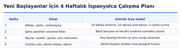 İspanyolca öğrenme süreci aşamalı planlanmalıdır. İlk etapta hedef, dili kusursuz kullanmak değil temel yapı taşlarını oturtmak olmalıdır. Bunun için ilk dört haftada alfabe, telaffuz, selamlaşma kalıpları, şahıs zamirleri, temel fiiller, sayılar, günler ve basit soru cümleleri üzerinde durulabilir. Sonraki haftalarda şimdiki zaman kullanımı, sıfat uyumu, günlük rutin anlatımı, temel okuma parçaları ve kısa dinleme egzersizleri eklenmelidir. Plan yapılırken her haftanın hem tekrar hem de küçük üretim hedefi içermesi gerekir.