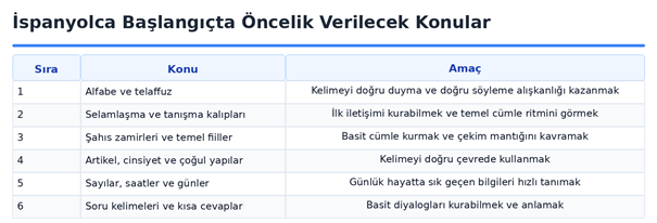İspanyolcada ilk öğrenilmesi gereken konuların başında şahıs zamirleri ve en temel fiiller gelir. Yo, tú, él, ella, nosotros, vosotros ve ellos zamirleri; cümlede öznenin nasıl değiştiğini anlamak için temel oluşturur. Bunun hemen ardından ser, estar, tener, llamar, ir ve hacer gibi sık kullanılan fiiller ele alınmalıdır. Bu fiiller hem günlük konuşmada çok sık kullanılır hem de daha karmaşık cümlelerin temelini oluşturur. Öğrenci önce bu fiillerin şimdiki zaman çekimlerini öğrenirse kısa sürede basit ama işlevsel cümleler kurabilir.