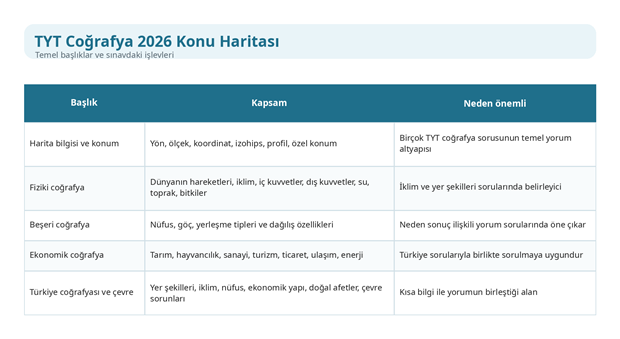 TYT coğrafya konuları 2026 kapsamında incelendiğinde temel çerçevenin genel coğrafya, fiziki coğrafya, beşeri coğrafya, ekonomik coğrafya, çevre ve toplum ile Türkiye coğrafyası başlıkları etrafında toplandığı görülür. Resmi konu ve kazanım duyurusu, sınav kapsamının lise coğrafya öğretim programındaki temel kavram ve becerilere dayandığını gösterir. Bu yapı içinde öğrenci; harita bilgisi, koordinat sistemi, özel konum, dünyanın şekli ve hareketleri, iklim bilgisi, yeryüzü şekilleri, nüfus, göç, yerleşme, ekonomik faaliyetler, bölgeler ve çevre sorunları gibi başlıkları bilmelidir. Sorular genellikle tek bir konuyu sormakla kalmaz, iki ya da üç bilgiyi aynı anda birleştirir.