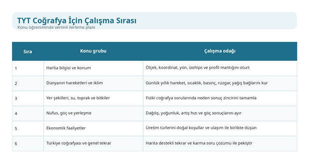 TYT coğrafya konuları verimli çalışılmak istendiğinde en doğru yaklaşım temelden yoruma giden bir sıra kurmaktır. İlk aşamada harita bilgisi, konum, dünyanın hareketleri ve temel coğrafi kavramlar tamamlanmalıdır. Bu bölüm yerleşmeden sonraki konuların iskeletini oluşturur. Ardından iklim, yeryüzü şekilleri, su varlığı, toprak ve bitkiler gibi fiziki coğrafya alanlarına geçmek gerekir. Çünkü nüfus, yerleşme ve ekonomik faaliyetler gibi beşeri başlıklar büyük ölçüde bu altyapı üzerinden anlaşılır. TYT coğrafya konuları çalışılırken konu sırasının doğru kurulması, zaman kaybını ciddi biçimde azaltır.