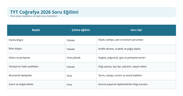Türkiye coğrafyası başlıkları da soru dağılımında belirgin biçimde öne çıkar. Türkiye'nin dağları, ovaları, platoları, akarsuları, kıyı tipleri, iklim alanları, nüfusun dağılışı, sanayi ve tarım bölgeleri yorum sorularında güçlü bir taban oluşturur. Son yıllarda doğrudan bilgi sorusundan çok, verilen bir harita, tablo ya da kısa açıklama üzerinden sonuca ulaşma biçimi daha işlevsel hâle gelmiştir. Bu nedenle TYT coğrafya soru dağılımını çalışırken sadece hangi başlıklar önemli sorusuna değil, hangi başlıkların farklı soru biçimleriyle gelebileceğine de odaklanmak gerekir.