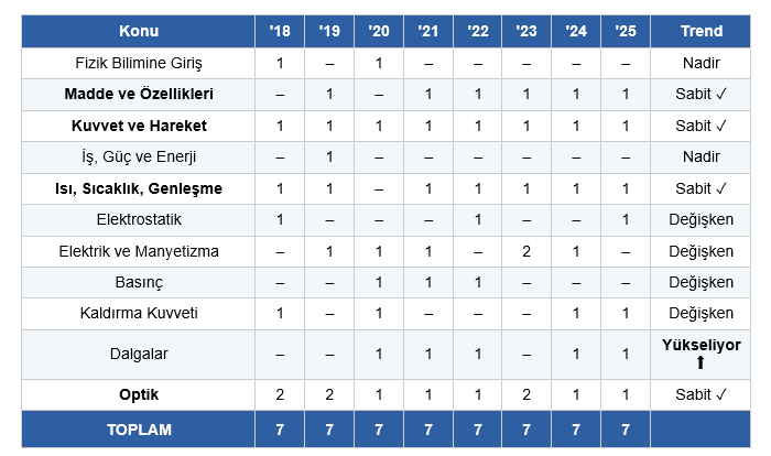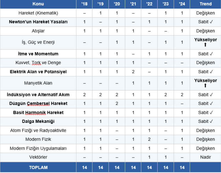 Tablonun özeti: İndüksiyon ve Alternatif Akım 7 yılın tamamında, çoğunlukla 2 soru. Basit Harmonik Hareket, Dalga Mekaniği ve İtme-Momentum da 7 yılın tamamında çıktı. Manyetik Alan son 4 yılda yükselişe geçti. Modern Fizik ve uygulamaları değişken ama sıralamada fark yaratan konular.